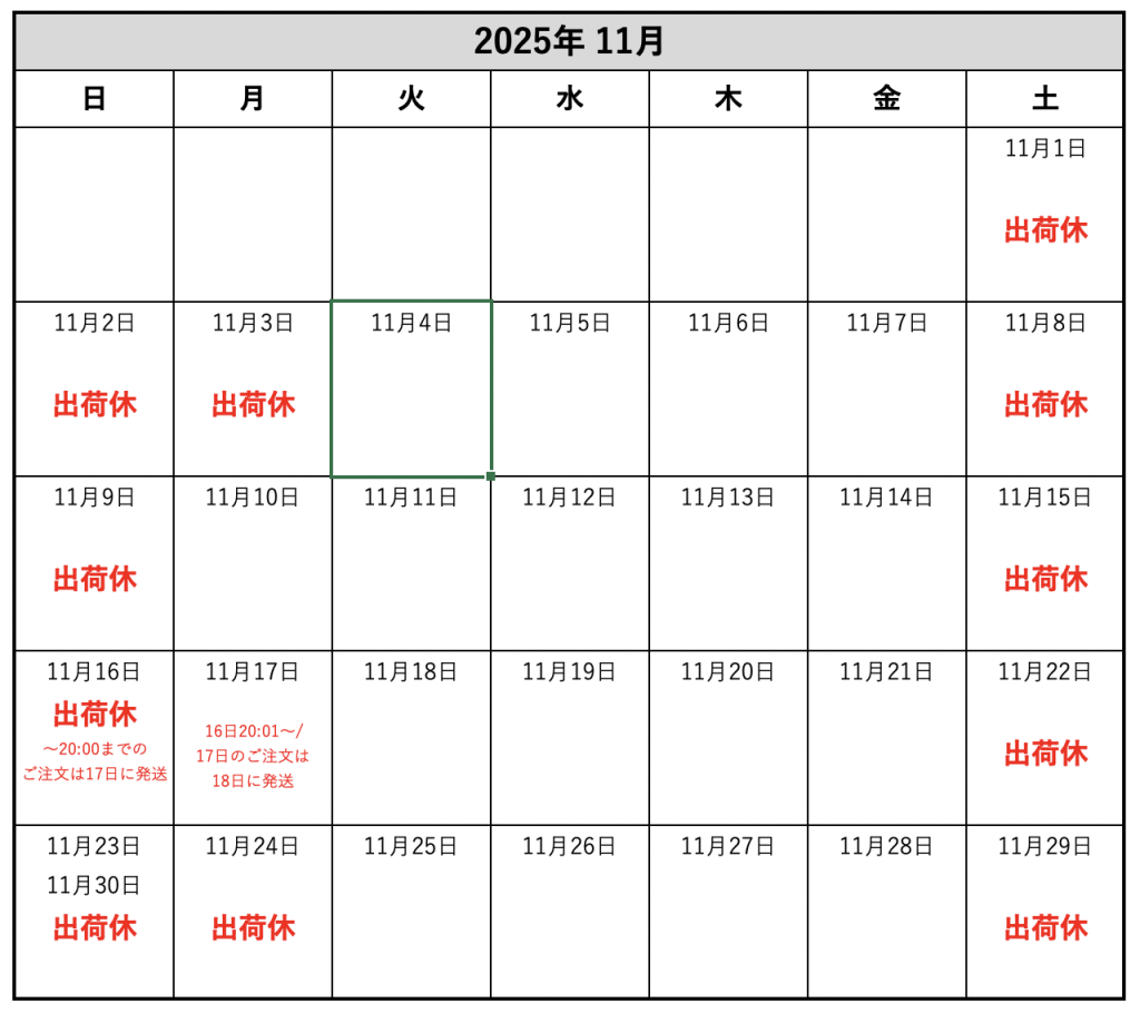 ※「出荷休」の日は発送業務・お問い合わせ対応業務を行っておりません。