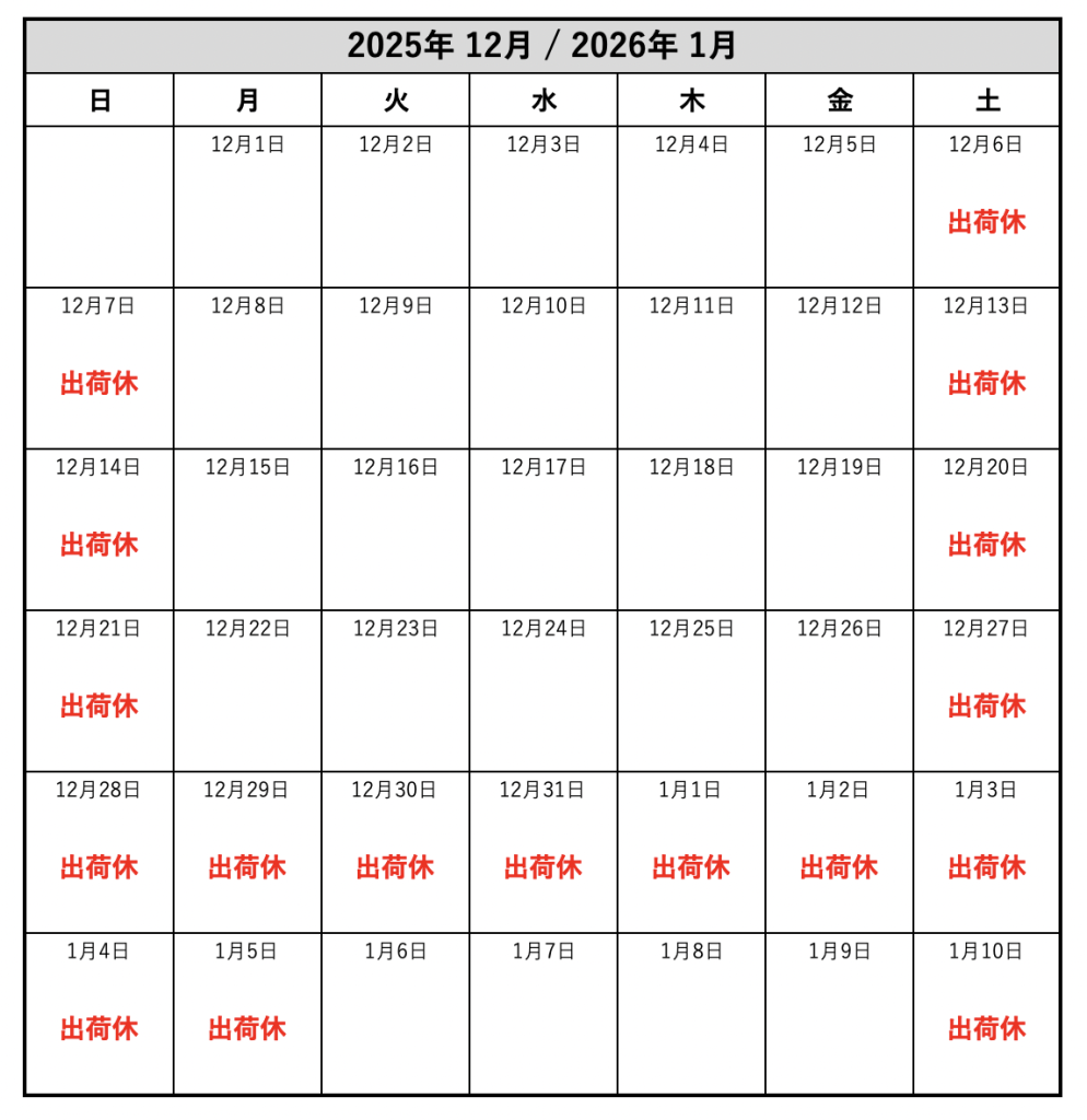 《年末年始休業期間:2025年12月27日(土) 〜 2026年1月5日(月)》